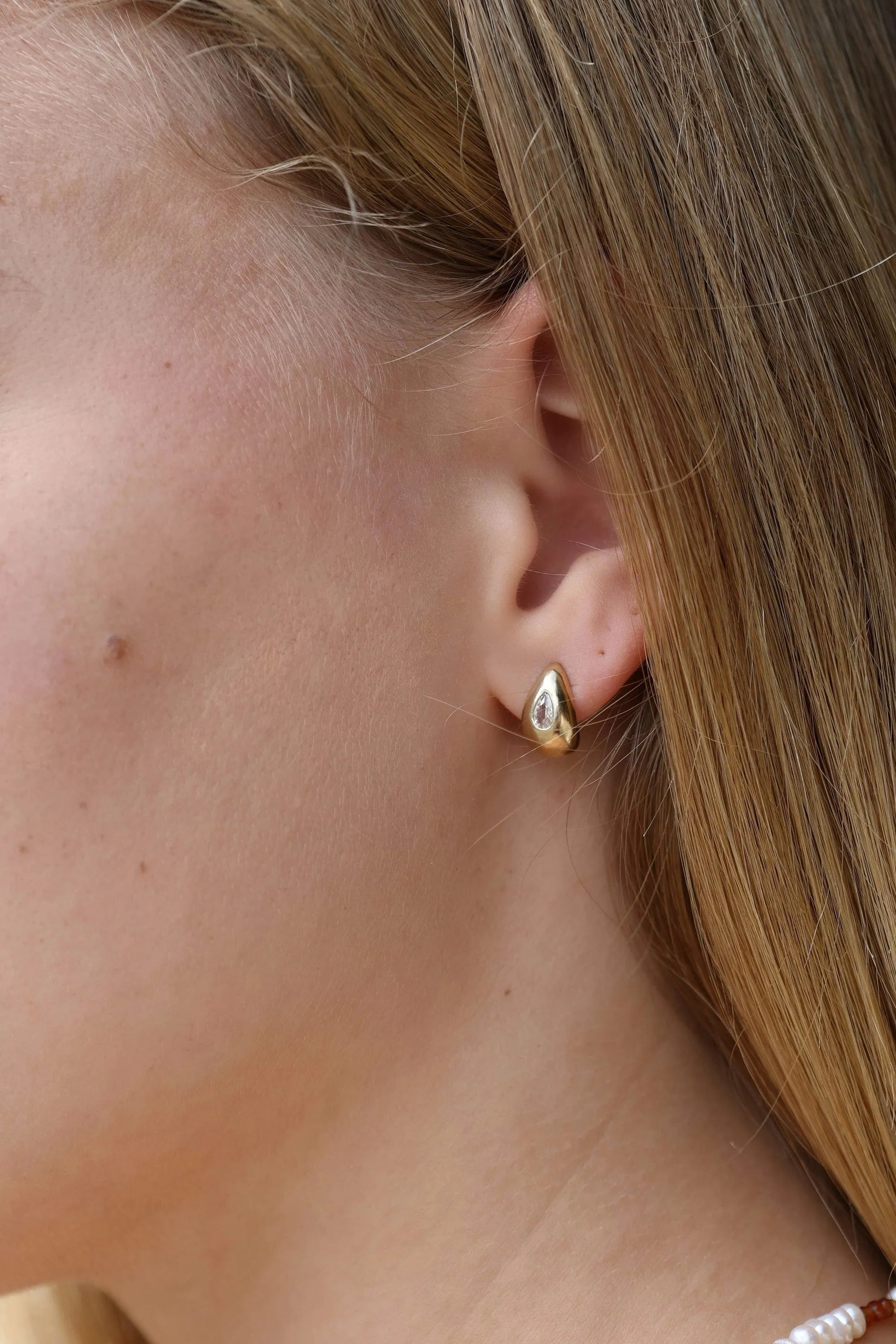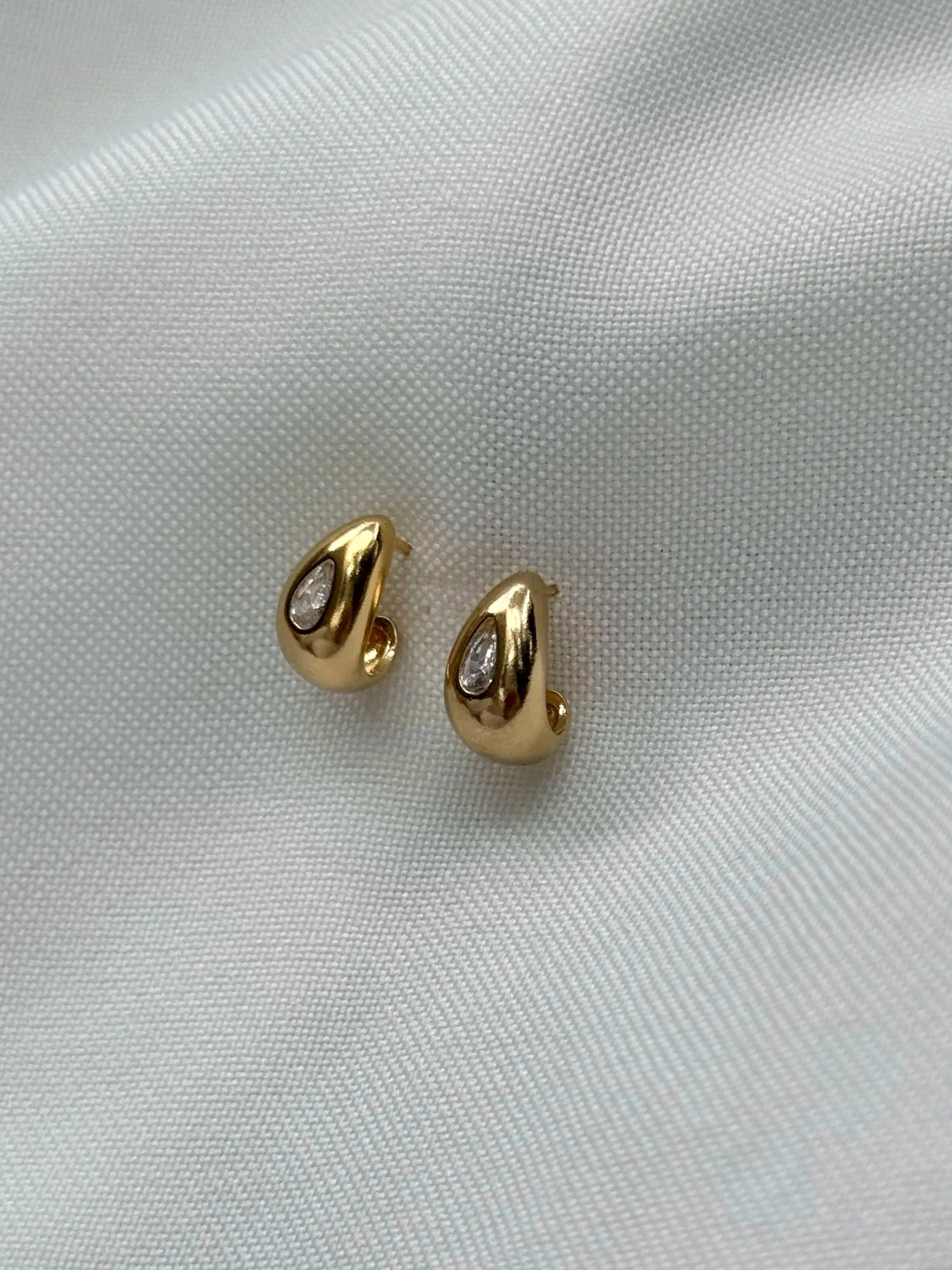 עגילי קמיל בצורת טיפה היסטריים עשויים ציפוי זהב 14k, משובצים זירקונים לבנים ועמידים במים גודל העגיל 12 מ״מ התכשיטים מגיעים ארוזים בקופסת מתנה ועם אחריות לשנה
