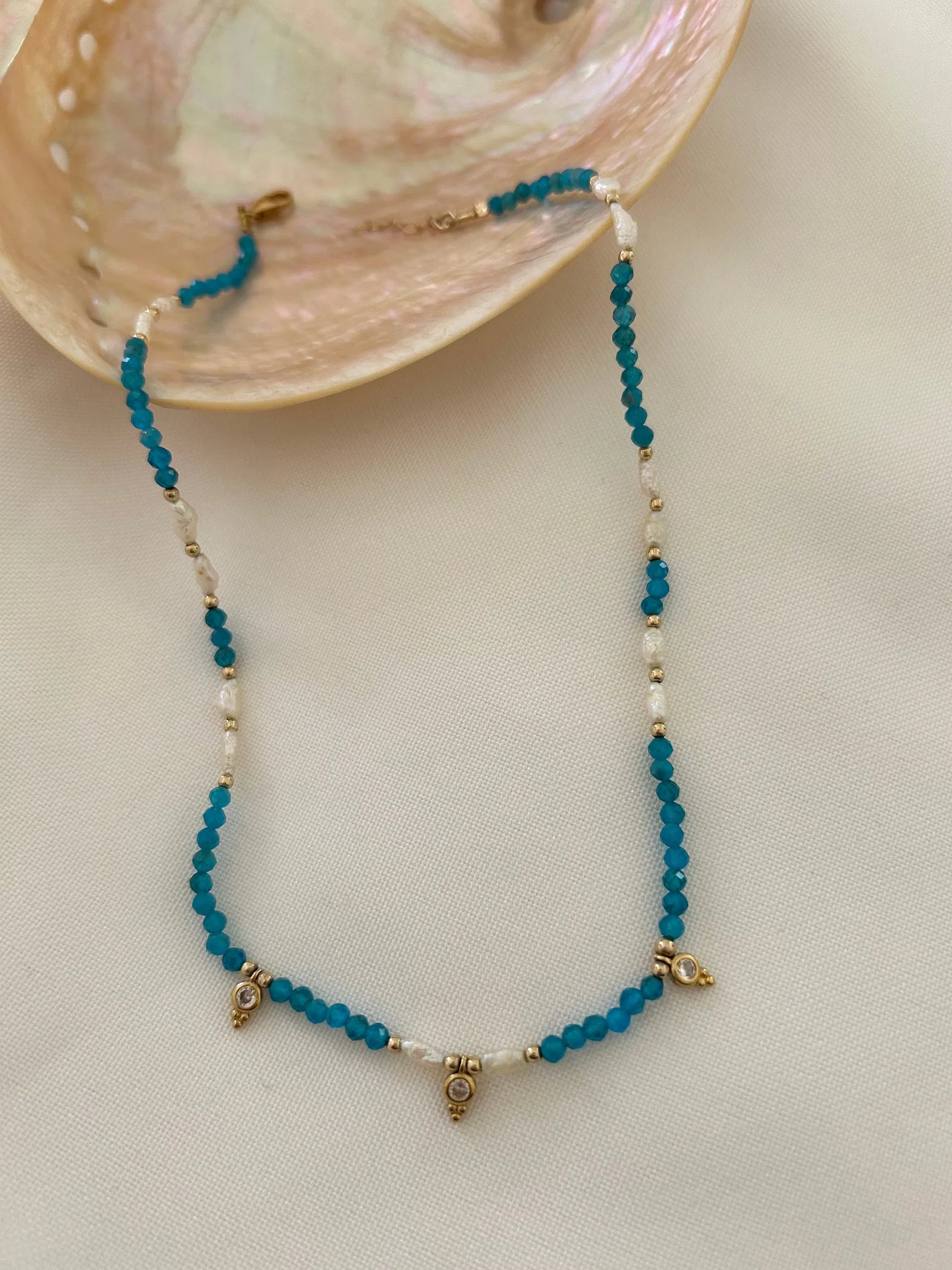 שרשרת לאמאי עשויה מאבני אפטייט, נגיעות פנינים טבעיות ואלמנטים משובצים זירקונים מציפוי זהב 14 קראט. אורך 35 ס"מ + 5 ס"מ שרשרת הארכה התכשיטים מגיעים ארוזים בקופסת מתנה ועם אחריות לשנה